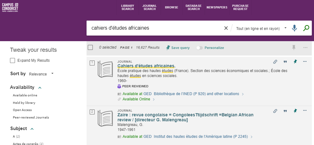 Example: when I search for Cahiers d'études africaines, I limit my search results to resources that are available online.